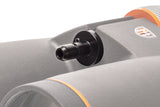 The stud (1/4X20 thread) affixes to the binocular hinge for long-term attachment, and the adapter attaches to a tripod head. For quick on/off access, the binoculars are locked in place with a twist of the top knurled knob.